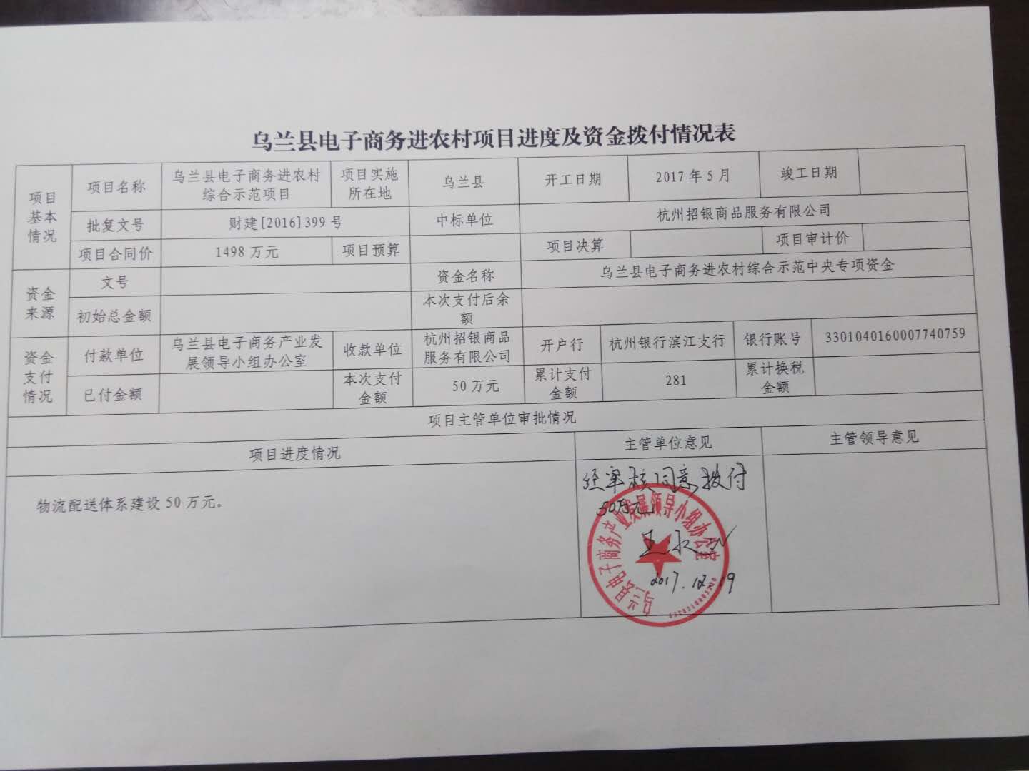 根据国家电子商务进农村综合项目资金支持方向,经杭州招银商品服务有限公司申报,县电商办审核批准,拟对杭州招银商品服务有限公司拨付项目建设资金50万元,现予以公示。公示时间为2017年12月15日至2017年12月18日。举报投诉时间为每周工作日上午8时30分至12时,下午14时30分至18时。