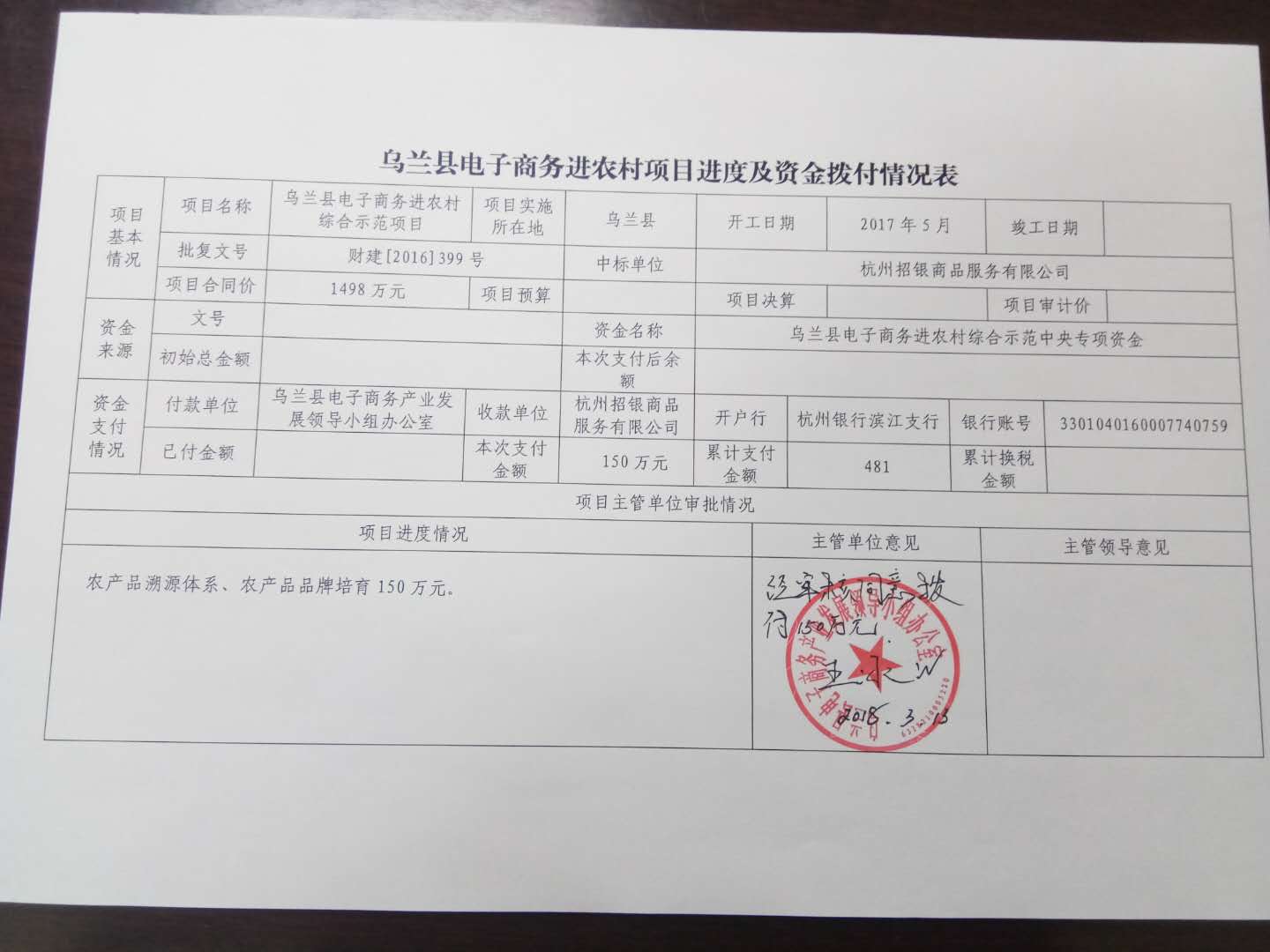 根据国家电子商务进农村综合项目资金支持方向,经杭州招银商品服务有限公司申报,县电商办审核批准,拟对杭州招银商品服务有限公司拨付项目建设资金150万元,现予以公示。公示时间为2018年3月7日至2018年3月11日。举报投诉时间为每周工作日上午8时30分至12时,下午14时30分至18时。