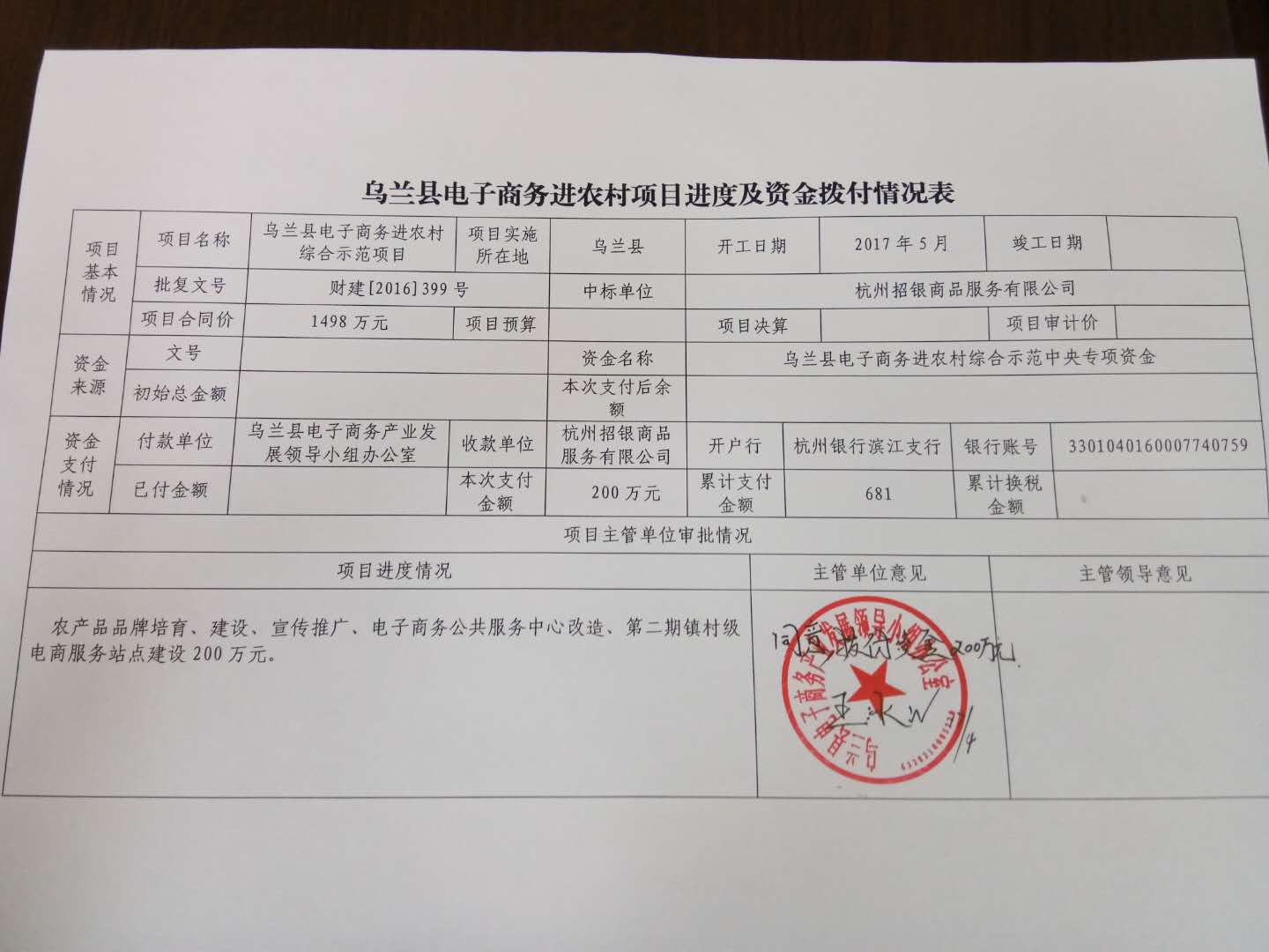 根据国家电子商务进农村综合项目资金支持方向,经杭州招银商品服务有限公司申报,县电商办审核批准,拟对杭州招银商品服务有限公司拨付项目建设资金200万元,现予以公示。公示时间为2018年4月10日至2018年4月13日。举报投诉时间为每周工作日上午8时30分至12时,下午14时30分至18时。