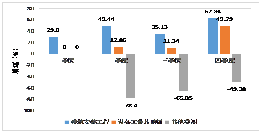 建筑安装工程328706万元,较上年同期增长62.84%;设备、工具、器具购置50279万元,较上年同期增长49.79%;其他费用23489万元,较上年同期下降49.38%。